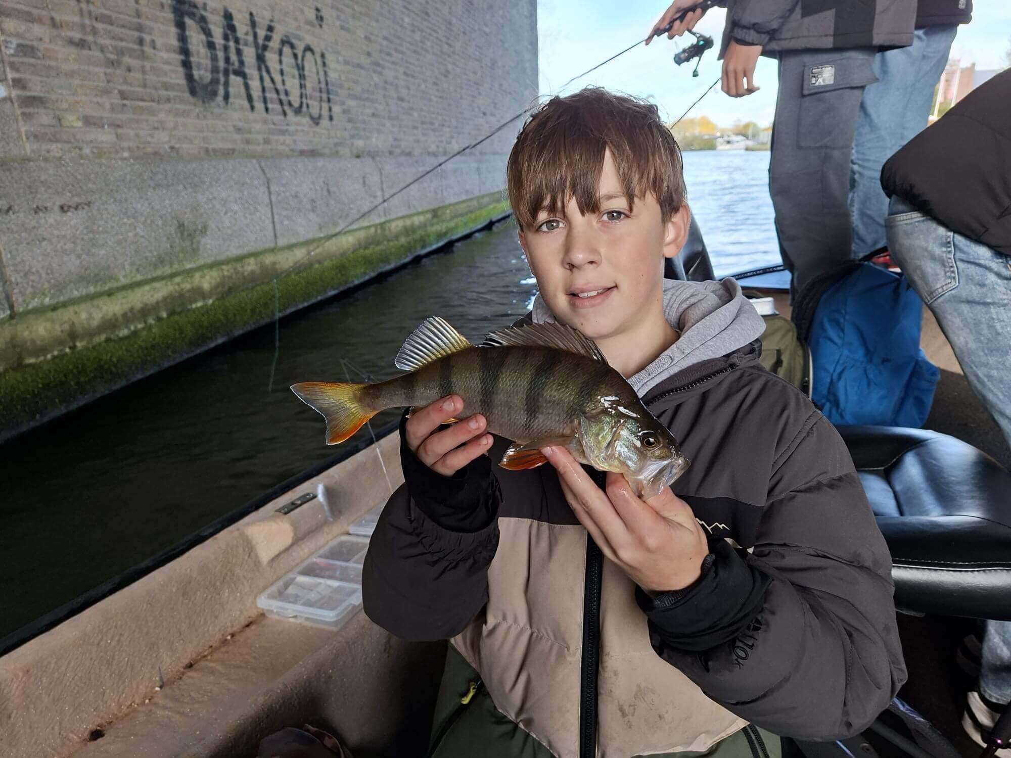 Eenmaal aan de waterkant wilden de leergierige deelnemers maar wat graag een roofvis vangen. Dat bleek lastiger dan gedacht, maar het enthousiasme was er niet minder onder. In onze vrijwilligers groepsapp verschenen de eerste foto's van vrolijke deelnemers met een gevangen baars of snoekbaars. Ondertussen vlogen de groepjes van stek naar stek om hun geluk te beproeven. Noah, met zijn tien jaar één van de jongste deelnemer was de geluksvogel van de dag: hij wist vakkundig een mooie snoek te vangen.